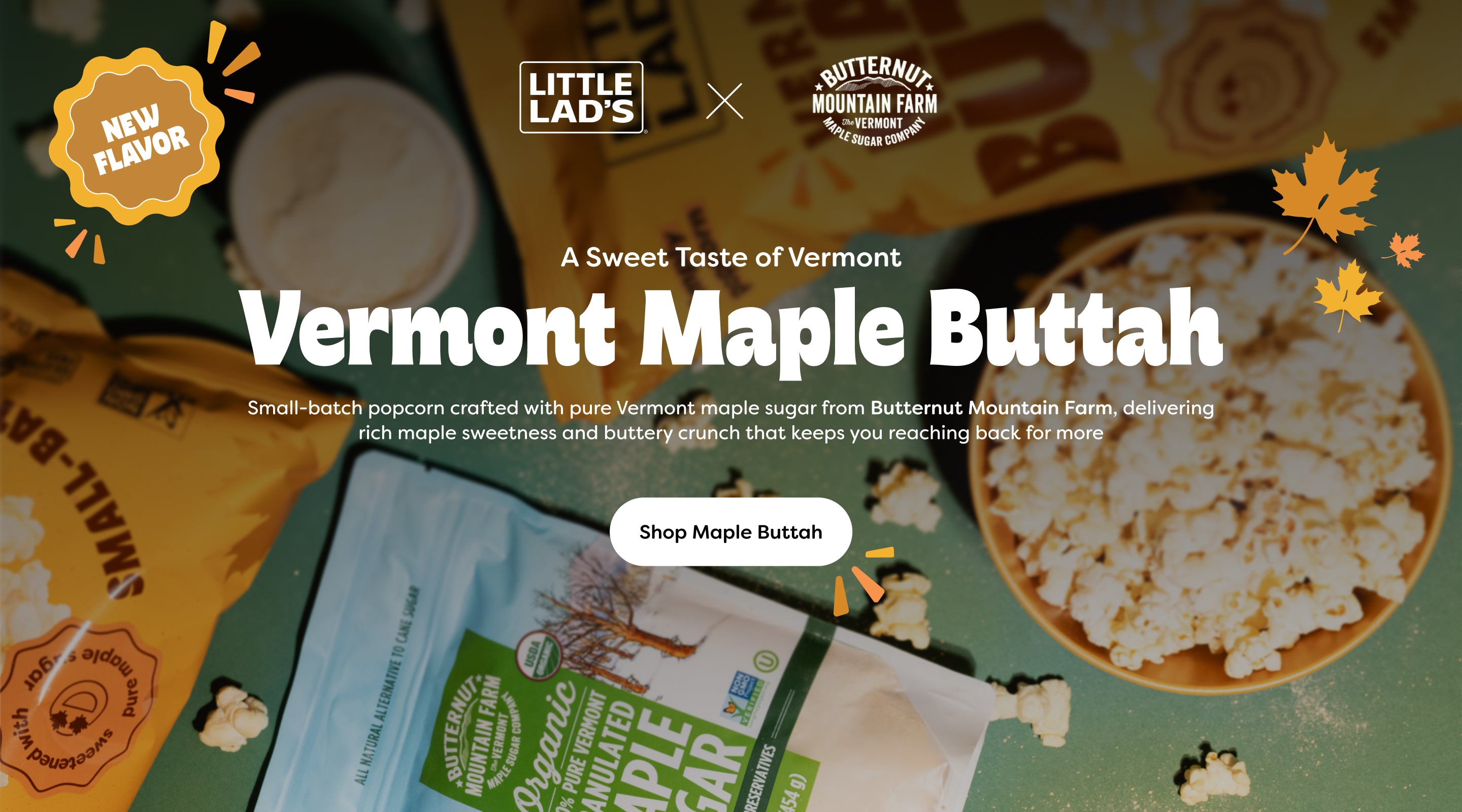 Crafted in small-batches and sweetened with pure Vermont maple sugar from Butternut Mountain Farm, Vermont Maple Buttah delivers a rich maple warmth wrapped in buttery kettle popped crunch. Try Maple Buttah.